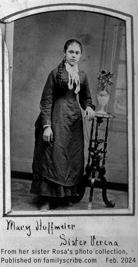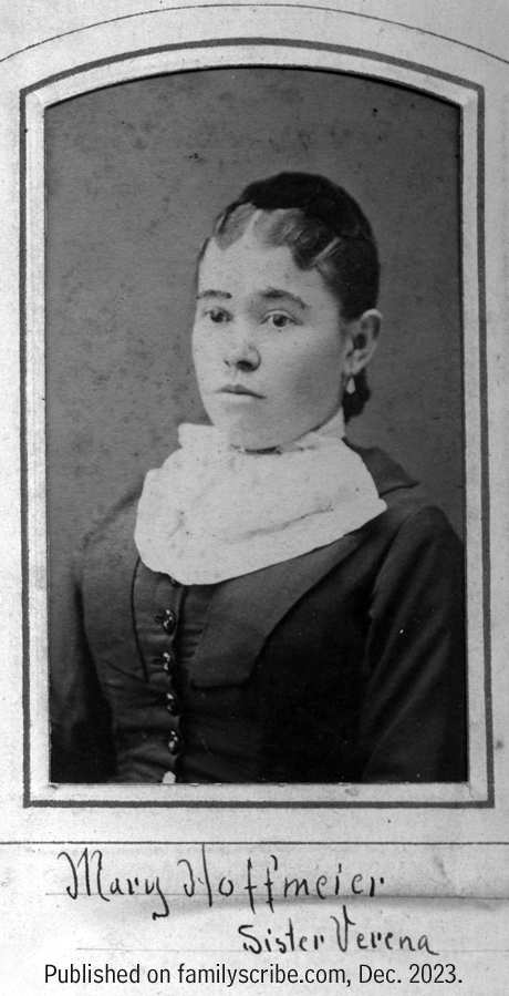 SISTER VERENA (Mary Hoffmeier) was born March 2, 1860, at St. Leon, Indiana, to Jacob and Benedicta (Koch) Hoffmeier, both natives of Switzerland. She was baptized Maria Helen at St. Peters, Indiana, on March 5, 1860. She had two sisters, Rosa and Paulina, and a brother, Carl. Their mother died March 2, 1861, at the age of 32 years. April 28, 1863, her father married Margeretha Kern. They were the parents of Jacob, Christina, Maria Magdalena, Anna, Margaret, Carolina and Anthony.
